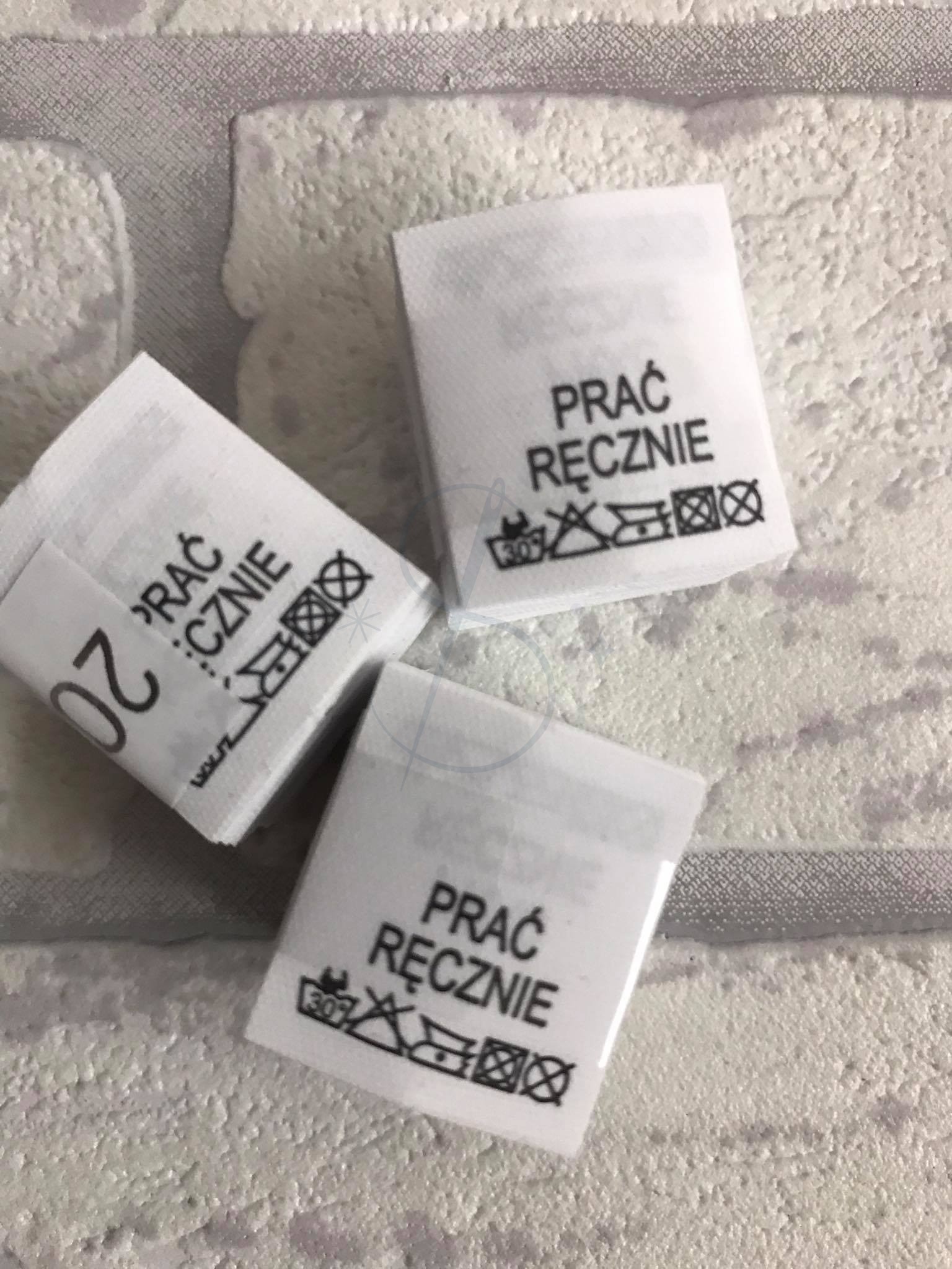 Wszywki odzieżowe cięte, nadrukowane na białej taśmie poliestrowej. Pakowane w kostkach po 200 szt.