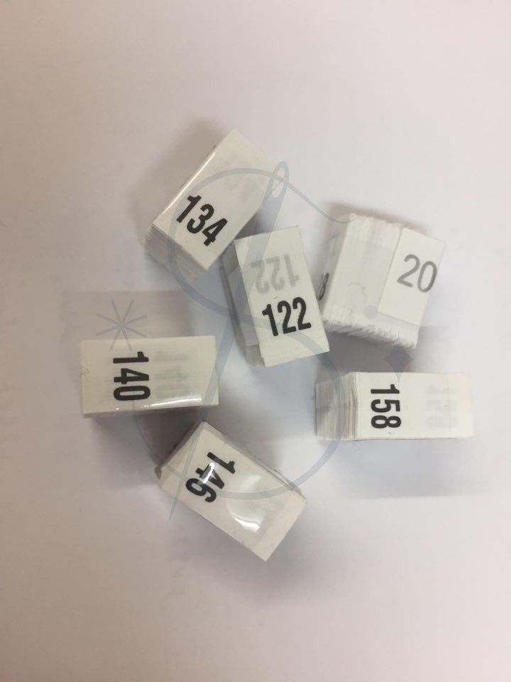Wszywki odzieżowe cięte, nadrukowane na białej taśmie poliestrowej. Pakowane w kostkach po 200 szt.