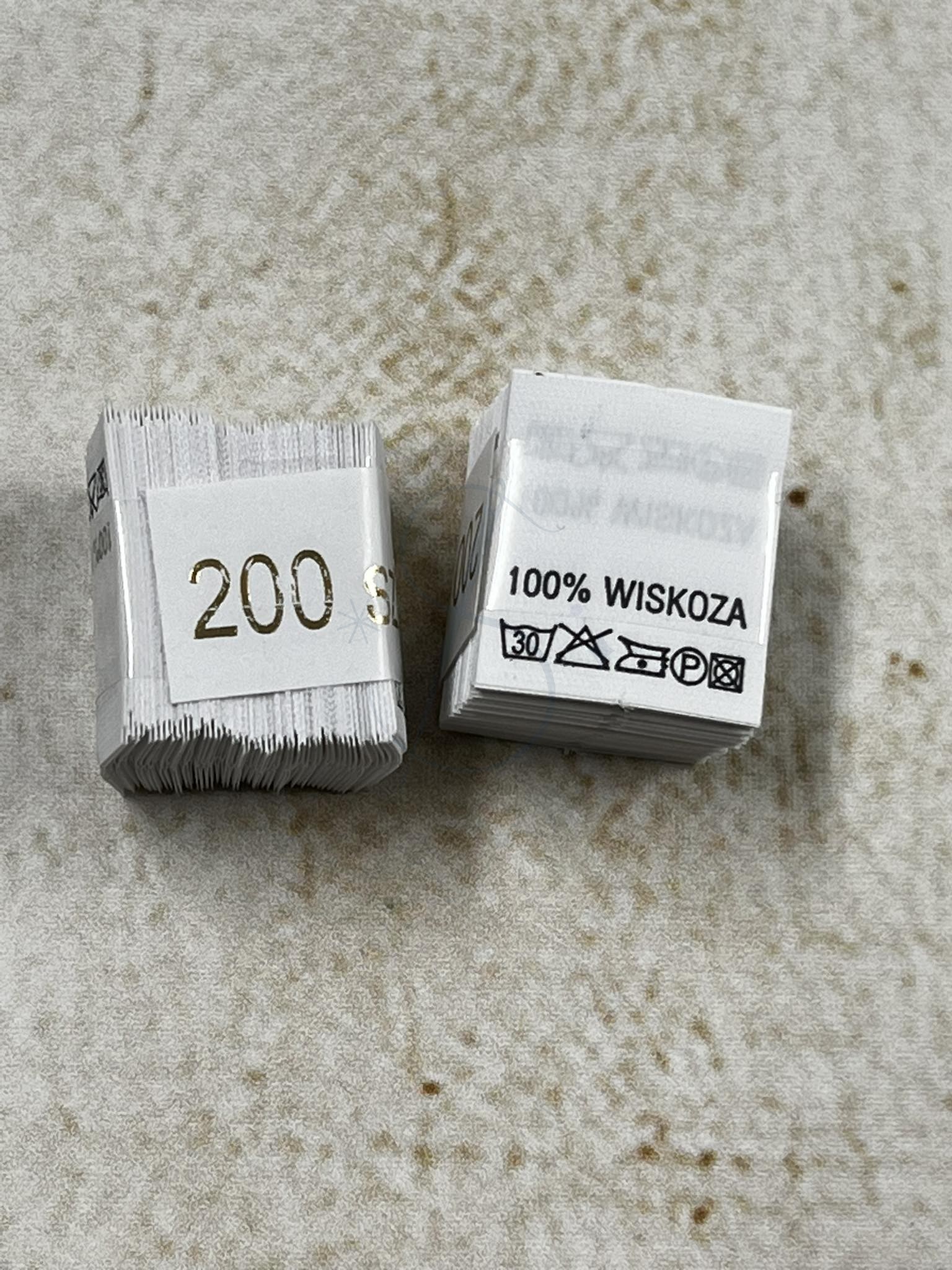 Wszywki odzieżowe cięte, nadrukowane na białej taśmie poliestrowej. Pakowane w kostkach po 200 szt.
